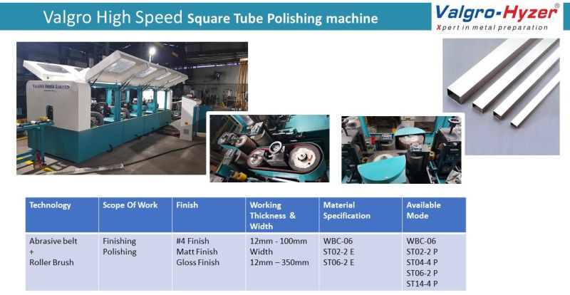 The Valgro Square & Rectangle Tube Polishing Machine is built specifically for surface finishing of square and rectangular tubes. Engineered with twin-head abrasive belt technology and conveyorised feed, it delivers uniform matt, satin, hairline or high-gloss finishes without distortion. This machine enables efficient in-house polishing, reduces handling and power consumption, and supports both wet and dry process variants.